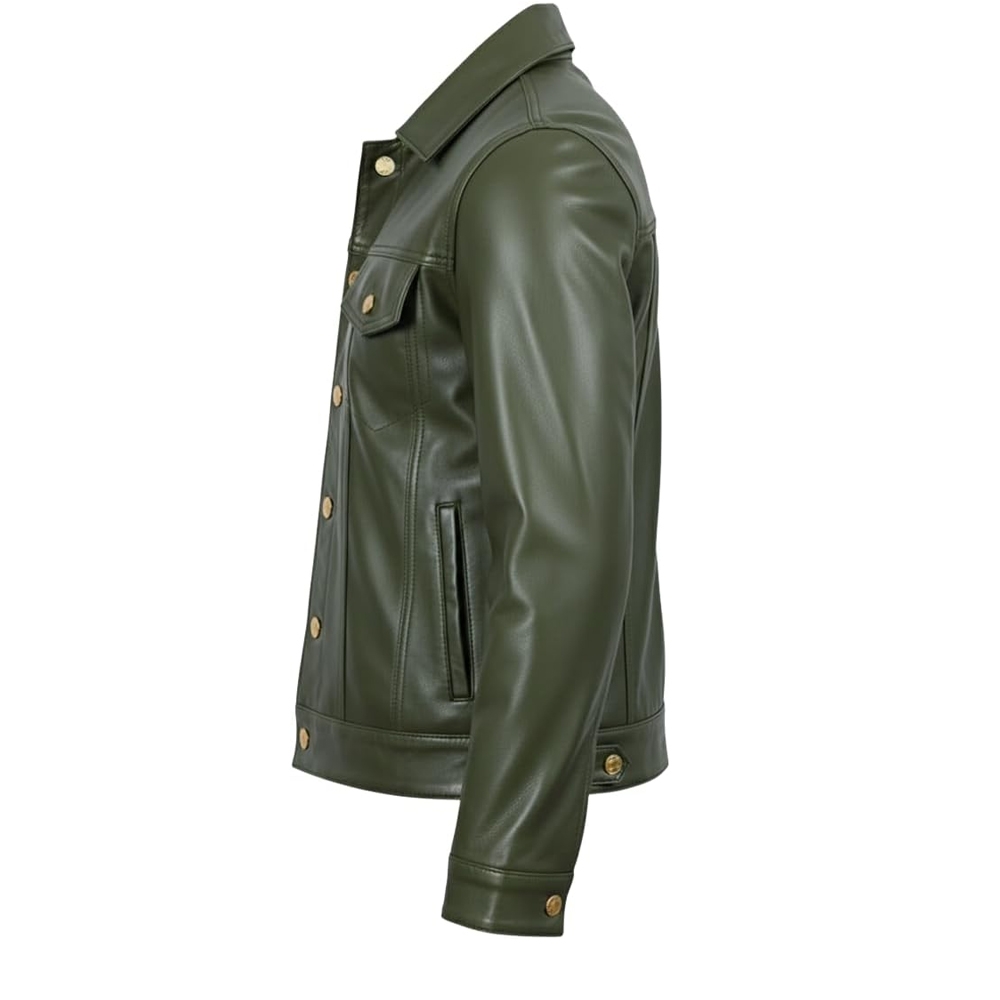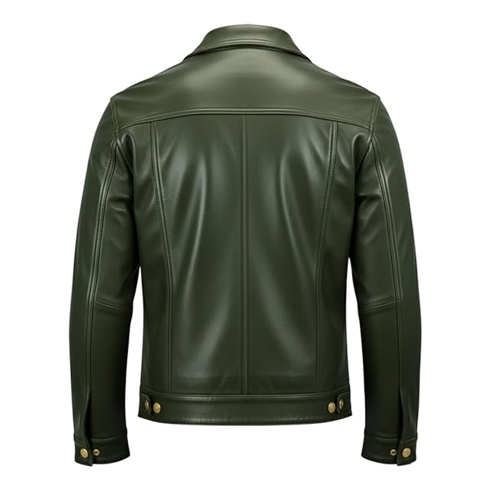 Made with 100% real leather and features robust stitching, silver buttons, and a classic harrington collar, exuding green vibes. This jacket is all about showing off your style and feeling comfy at the same time.